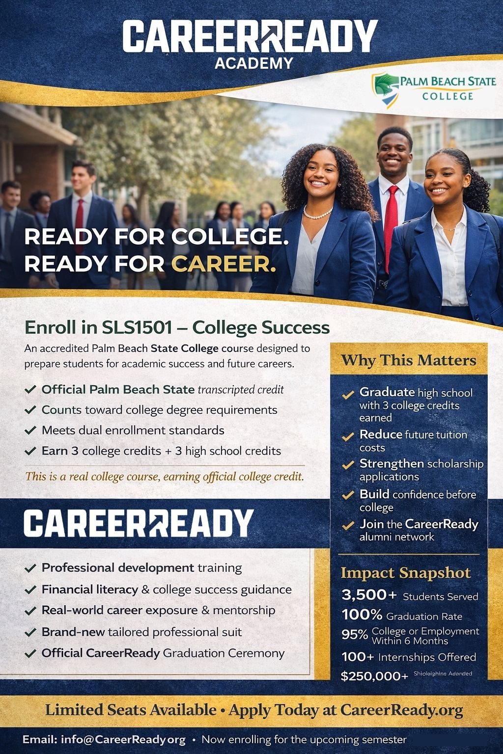 CareerReady Academy’s Dual Enrollment program gives high school students the opportunity to earn real college credit through Palm Beach State College while building the academic, personal, and professional skills needed for long-term success. Students enroll in SLS1501 – College Success, an accredited college course that counts toward degree requirements and appears on an official transcript. At the same time, CareerReady provides structured support in leadership development, financial literacy, career preparation, and internship readiness, creating a complete college and career foundation.